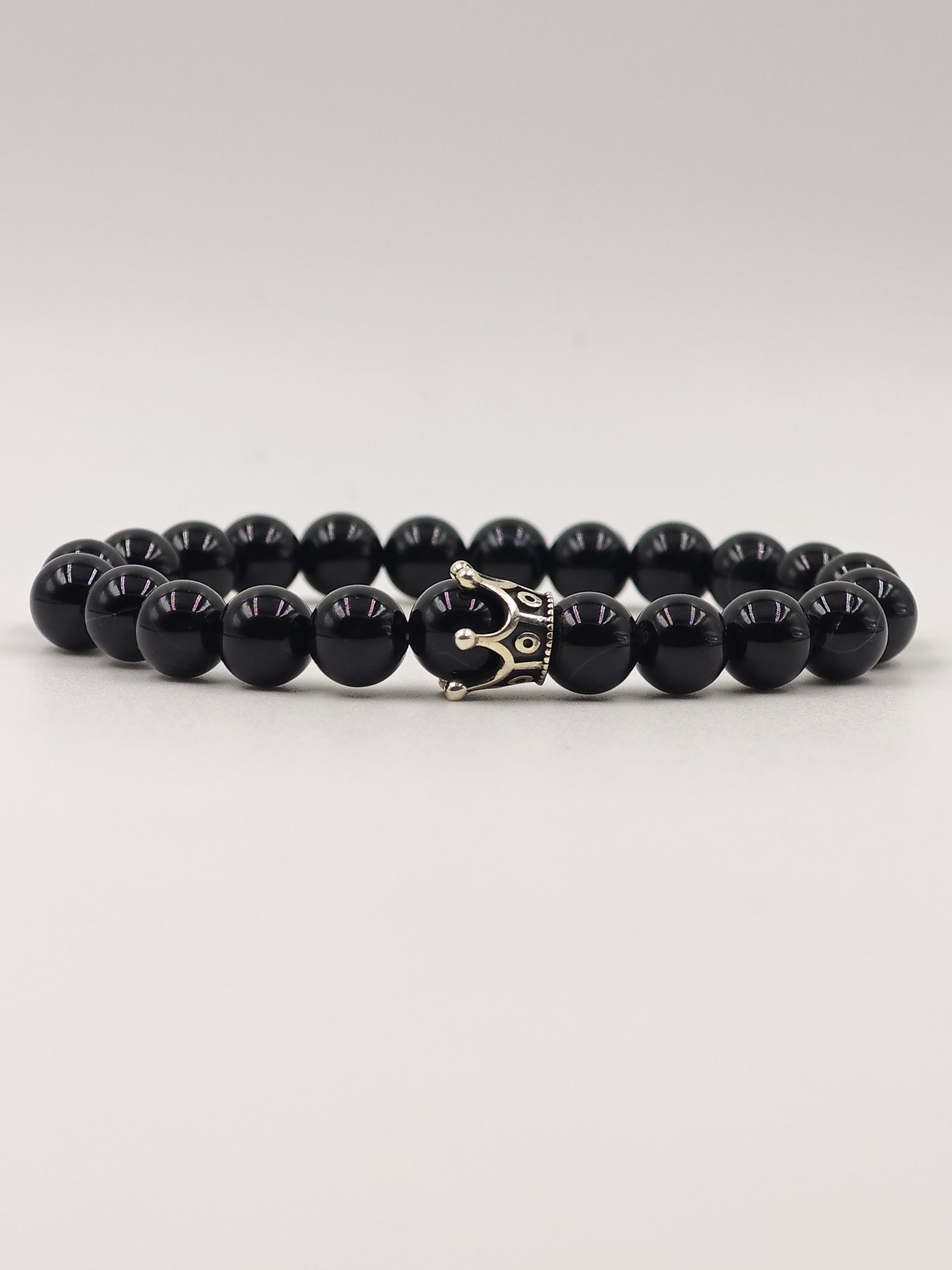 BLACK OBSIDIAN BEADED BAND WITH SILVER CROWN CLASP