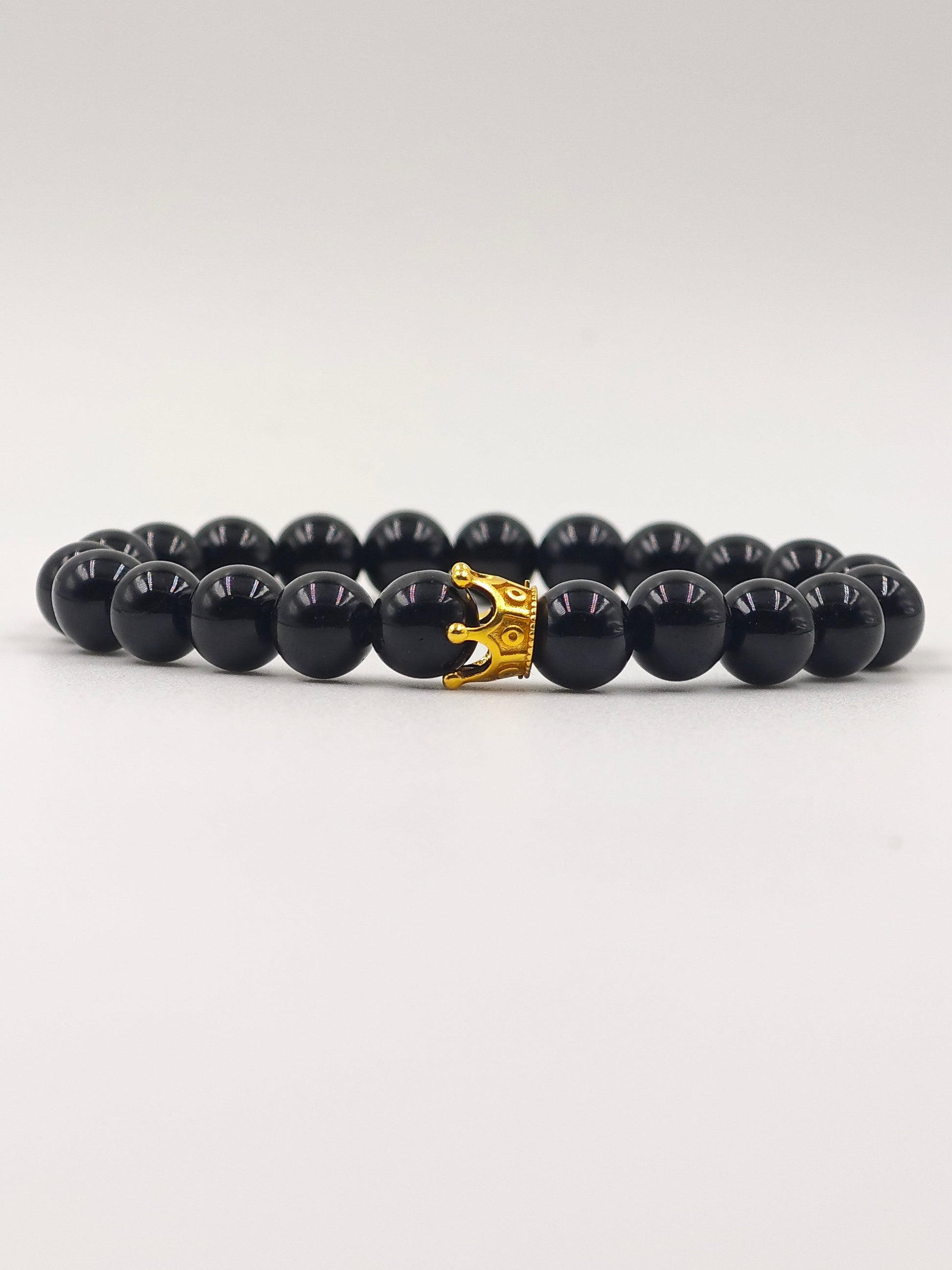 BLACK OBSIDIAN BEADED BAND WITH SILVER CROWN CLASP GOLD PLATTED